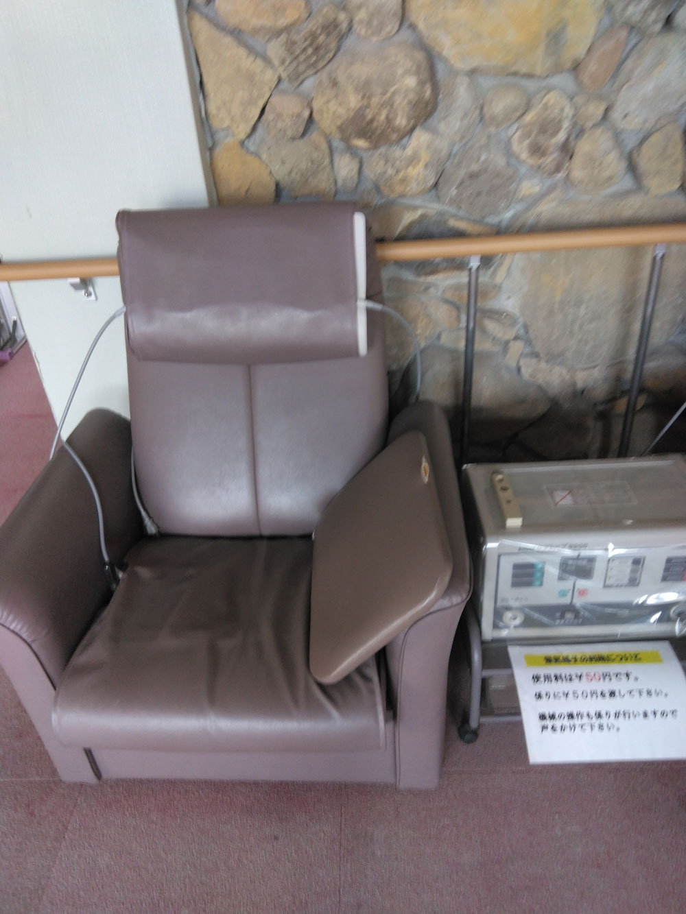 お風呂上りにマッサージチェアーでリクライニング! カラオケでお友達と楽しく時間を過ごしてください。 カラオケ(1曲 100円)・マッサージチェアー(1回 100円)・電気チェアー(1回 50円) |